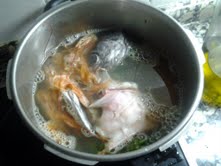 Poner en una cacerola cinco cucharadas de aceite. Cuando esté caliente, sofreír un poco la parte verde del puerro y la cebolla, que habremos lavado. Echar las espinas de pescado, la moralla y las verduras. Pelar las gambas y retirar el cuerpo. Lo sobrante se lo añadís. Yo lo hago con gambón para no estar mucho tiempo pelando marisco. Dar unas vueltas, y añadir el agua, el perejil y la sal. Desespumar con paciencia y dejar cocer unos veinte minutos. Colar y reservar.